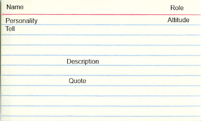 Much like the plot cards, I created a deck of Cast cards using three generators, The Thieve's Guild Person and Name generators, and for the personality, I went with 101 Quick NPC personalities. The cards follow a simple format, as seen below.